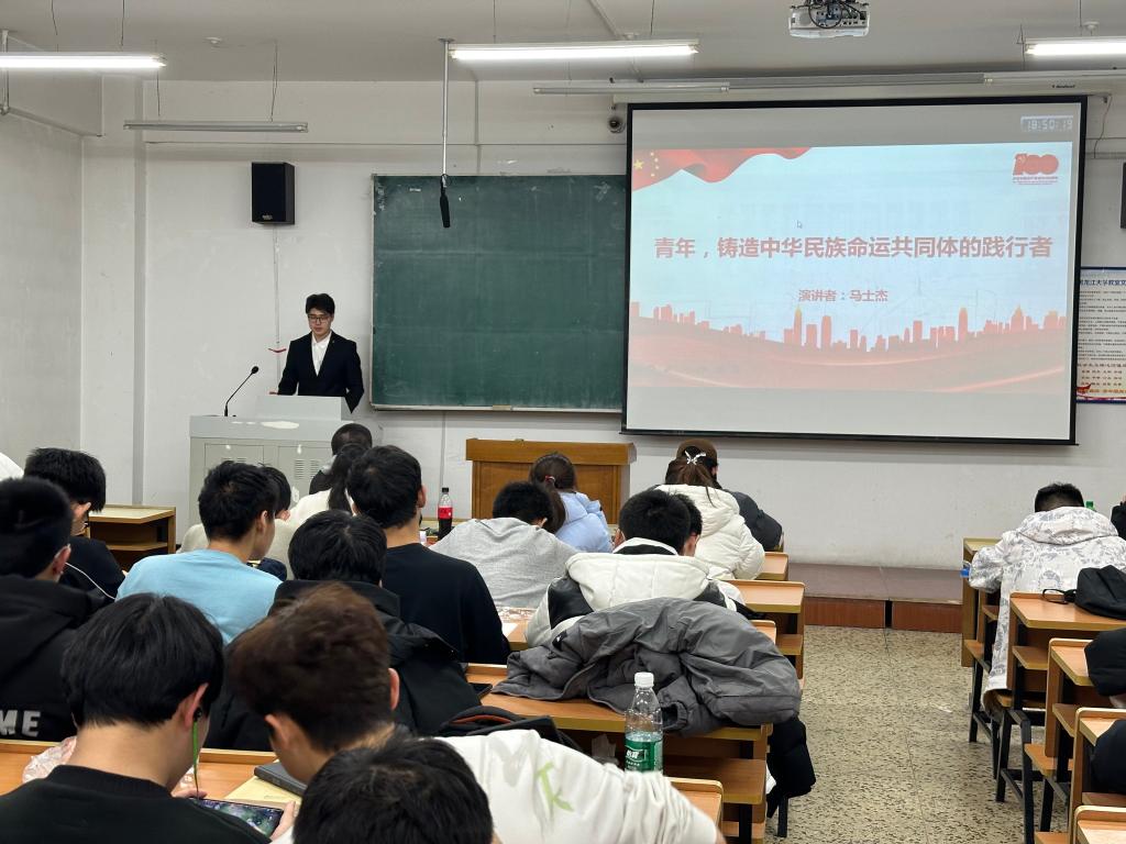 随后,马士杰同学以《青年,铸造中华民族命运共同体的践行者》为主题,讲述了青年人在建设中华民族命运共同体中的重要作用,我国是56个民族共同组成的国家,只有各民族共同发展,共同繁荣,才能推动一个国家积极发展。作为黑大学子,我们要积极发挥当代青年的作用,铸牢中华民族共同体意识。