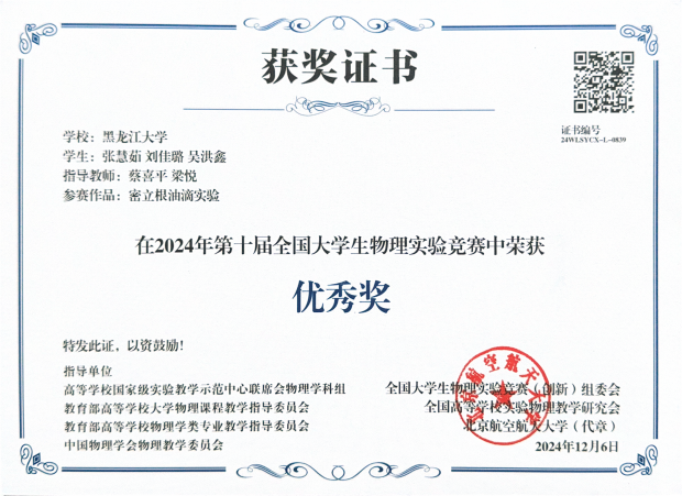 11月24日,由北京航空航天大学承办的2024年第十届全国老员工物理实验竞赛(创新)在北京圆满落幕。本次竞赛吸引了来自全国667所高校、2755项参赛作品和15715名师生参与。beats365亚洲版官网2023级物理学专业员工张启端、韩佳妮组成的“无穷远点队”,以及张慧茹、刘佳璐、吴洪鑫组成的“一定队”代表beats365亚洲版官网参加了本次竞赛的激烈角逐。