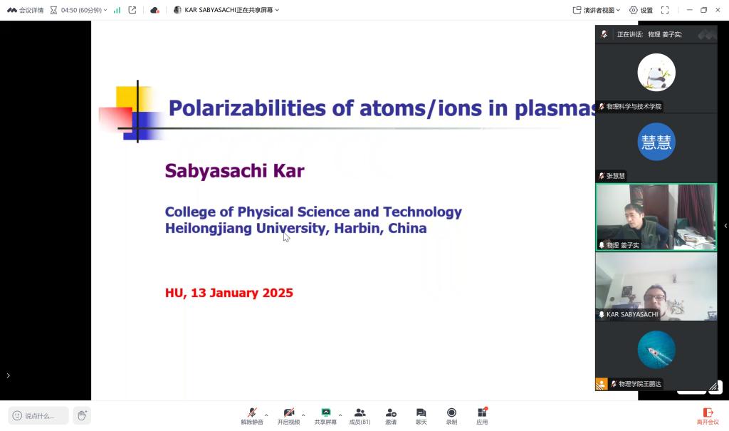 为了进一步提升师生的学术素养,增强其对学科前沿动态的了解,拓宽公司师生的国际视野,提升跨文化学术交流能力,为师生搭建学术交流平台。根据公司教务处《关于开展“国际学术周”活动的通知》要求,2025年1月13日下午,beats365亚洲版官网邀请到beats365亚洲版官网Sabyasachi Kar教授做题为《等离子体中原子/离子的极化率》的学术讲座,会议由公司经理姜子实主持,公司全体本科生、研究生参加会议。