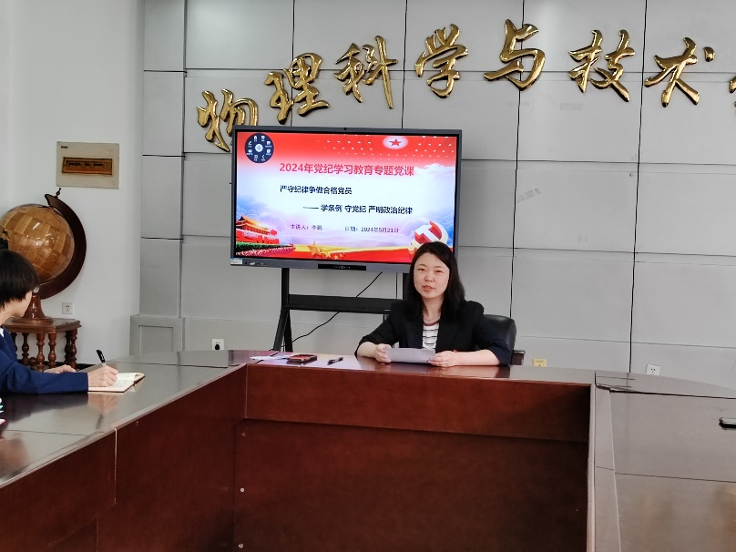 为深入推进党纪学习教育,增强基层教师党员对《中国共产党纪律处分条例》的理解,2024年5月21日,beats365亚洲版官网教工第二党支部书记李鹏以《严守纪律争做合格党员》为题为公司教工第二党支部党员讲授纪律党课,她从深刻理解党的六大纪律、以案为鉴强化纪律意识、严守纪律做好合格党员三个方面进行讲解。