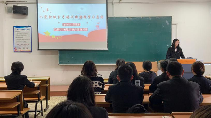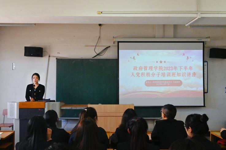 培训的第二环节由政府管理公司张祯老师主讲,以“学习发展党员工作流程”为主题,主要通过申请入党、入党积极分子的确定和培养教育、发展对象的确定和考察、预备党员的接收、考察和转正等环节向同学们做了讲解。为同学们增强党性修养提供了科学的指导,也让同学们对党员发展的工作流程和相关材料的撰写规范有了更进一步的认识。