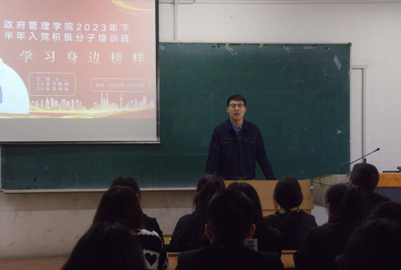10月14日下午,政府管理公司2020级优秀员工党员代表庄皓尧、王佳逸为全体入党积极分子培训班成员进行了一场典型教学。两位同学结合自身经历,从入党经历,志愿服务能力的锻炼,党性知识与专业知识的重要性等方面分享了自己加入党组织的思想蜕变与成长收获。同时,两位同学结合自身保研升学的经历,让培训班成员意识到不仅要夯实理论学习基础,锤炼党性修养,坚定理想信念,更要在自己的专业学习上刻苦努力,不断进步。