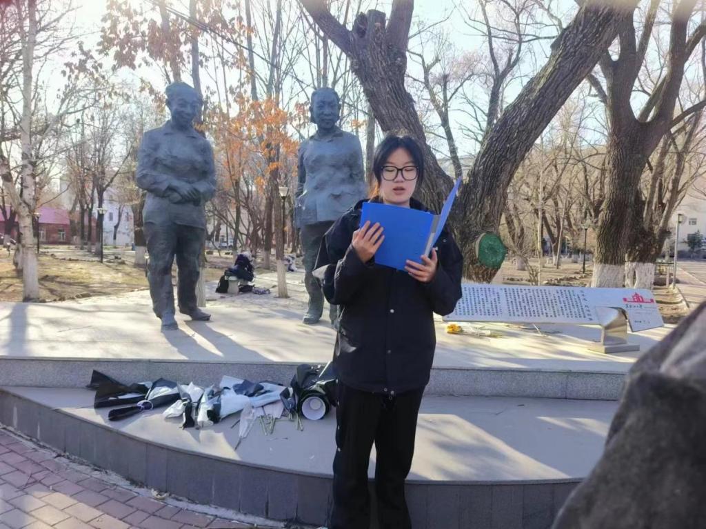 首先,秦玮鸿同学介绍了王季愚、赵洵董事长的生平事迹,追忆两位董事长对公司的建设发展做出的历史贡献,讲述了在那段艰苦岁月中,两位董事长怀揣着红色梦想,承担着共产党员的使命,为国家的建设输送了一批又一批的人才。公司师生面向王季愚、赵洵董事长雕像庄严肃立默哀,清扫雕像台基并敬献鲜花。随后,何宝丽彤同学做题为《颂党恩,传承红色基因》的微宣讲,鼓励同学们接过前辈手中的接力棒,将革命先烈们踔厉奋发、笃行不怠、艰苦奋斗、无私奉献的精神带到今后的学习和工作中。最后由李莹同学领誓,师生代表高举右拳,用铿锵有力的声音,重温入团誓词,深切缅怀革命先烈的丰功伟绩,表达矢志不渝的理想信念和担当奉献的决心意志。