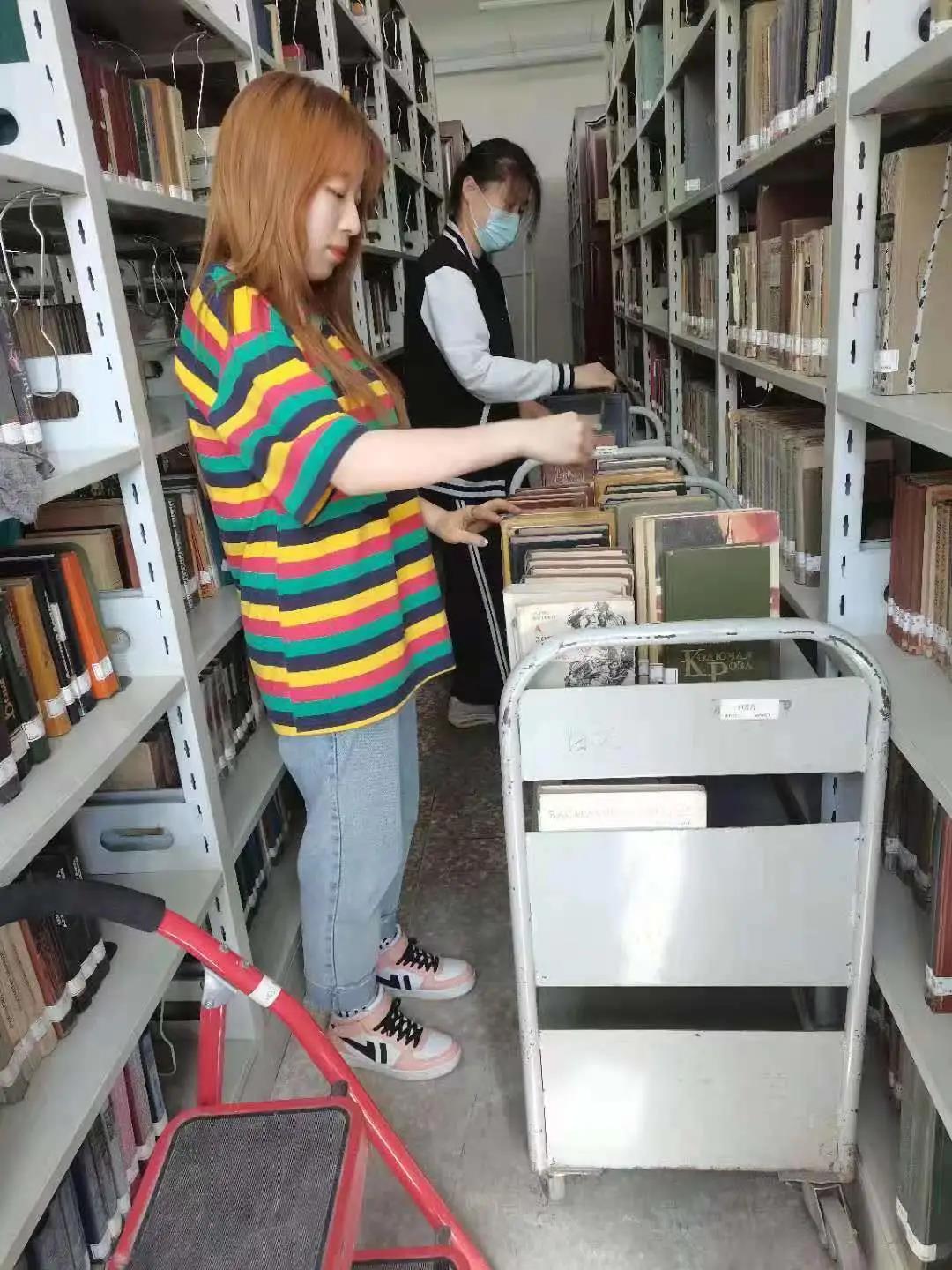 在与图书馆工作人员交流后,志愿者们分为三组,分别打扫俄语图书室、阳光书屋和图书馆仓库。志愿者们将书籍从书架中取出,用小刷子将上面的灰尘细细扫去,清理书架后再将书籍放回原处。