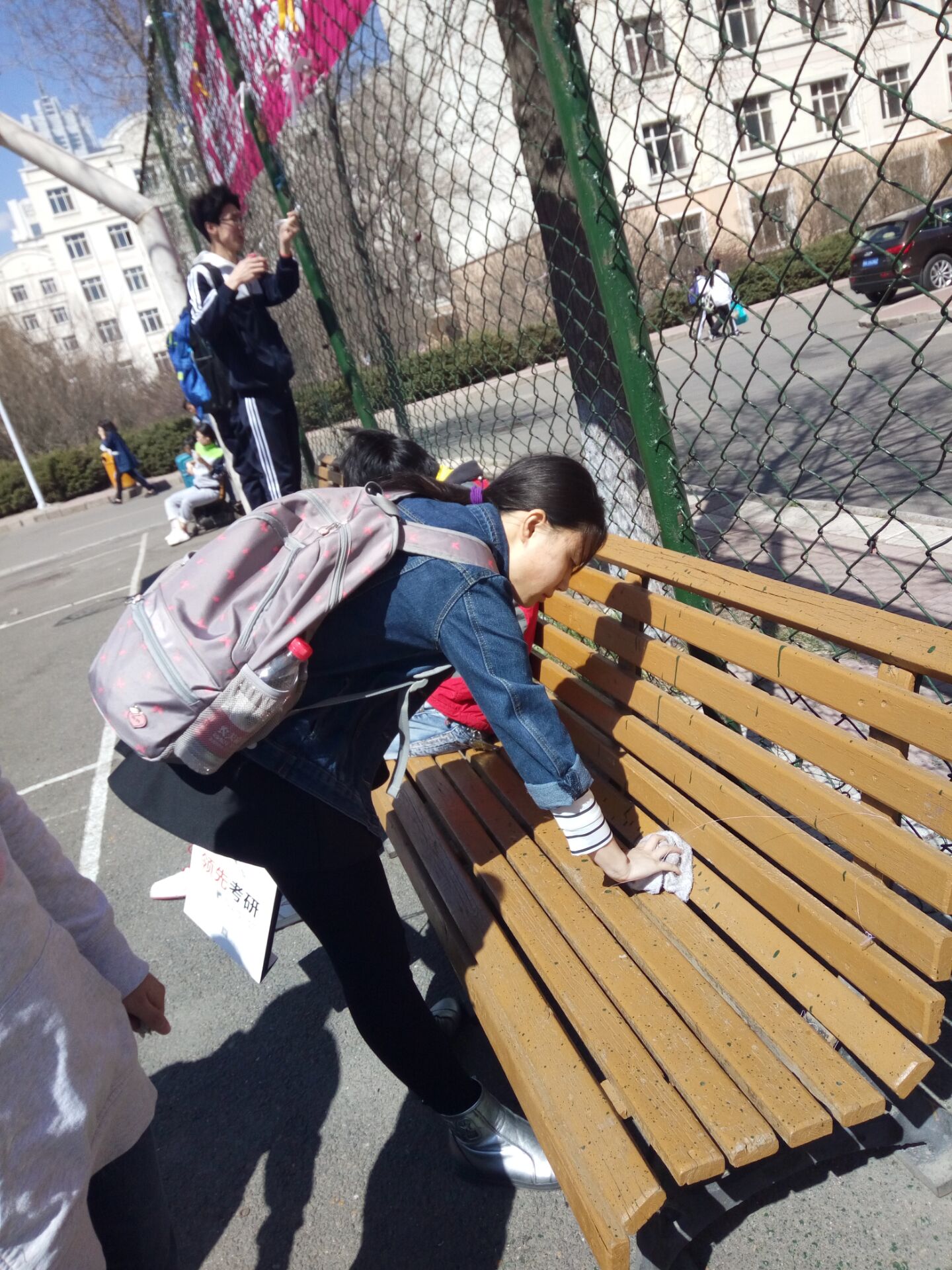为清理B区篮球场铁栅栏上的条幅“遗物”和长条木椅上的灰尘,