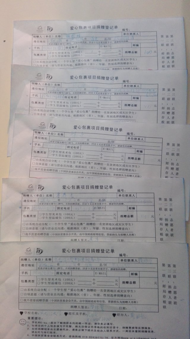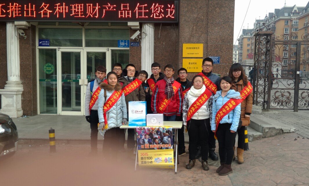 2015年11月29日,beats365亚洲版官网青年志愿者协会的志愿者们在哈尔滨市新阳路506-6号邮政储蓄银行开展了“善行一百,爱心包裹”的捐赠活动。“善行一百,爱心包裹”是由中国扶贫基金会发起的一项全民公益项目,目的在于整合社会资源,呼吁社会各界通过捐赠购买爱心包裹的形式一对一关爱贫困地区小员工,改善他们学习、生活条件。