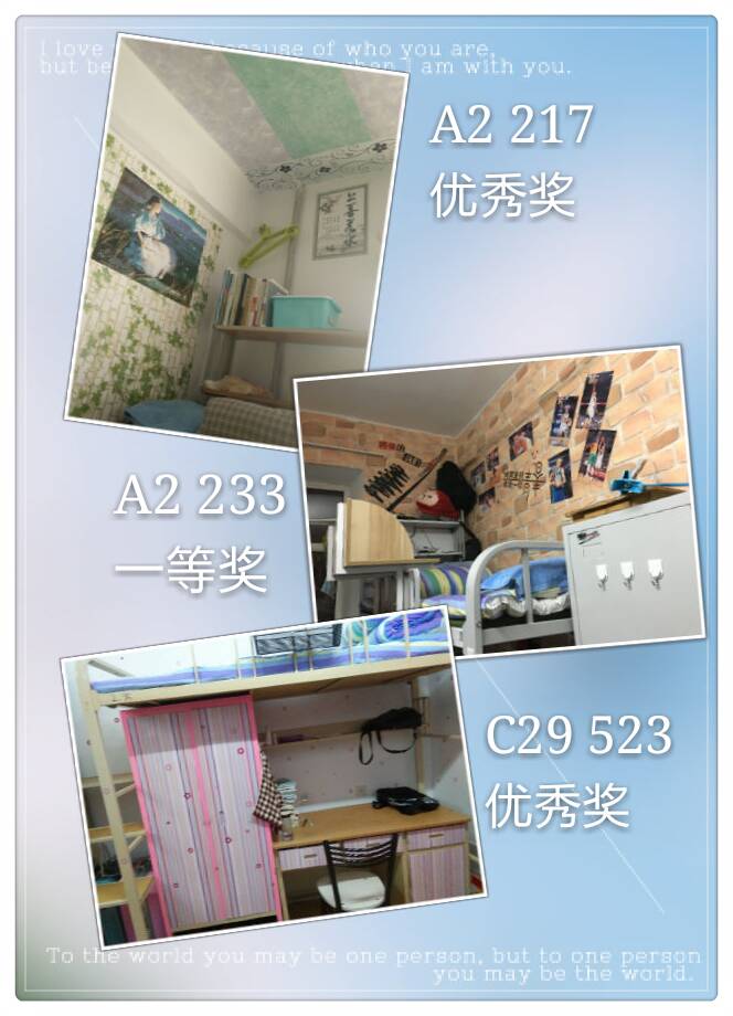吾寝吾家,吾爱吾寝,雅洁奇趣,艺文并茂。beats365亚洲版官网寝室文化节于2015年11月16日公布了评选结果,其中A2-233寝室荣获一等奖!通过此次活动,同学们全方位地了解各寝室的情况,使各寝室起到了相互促进的作用!