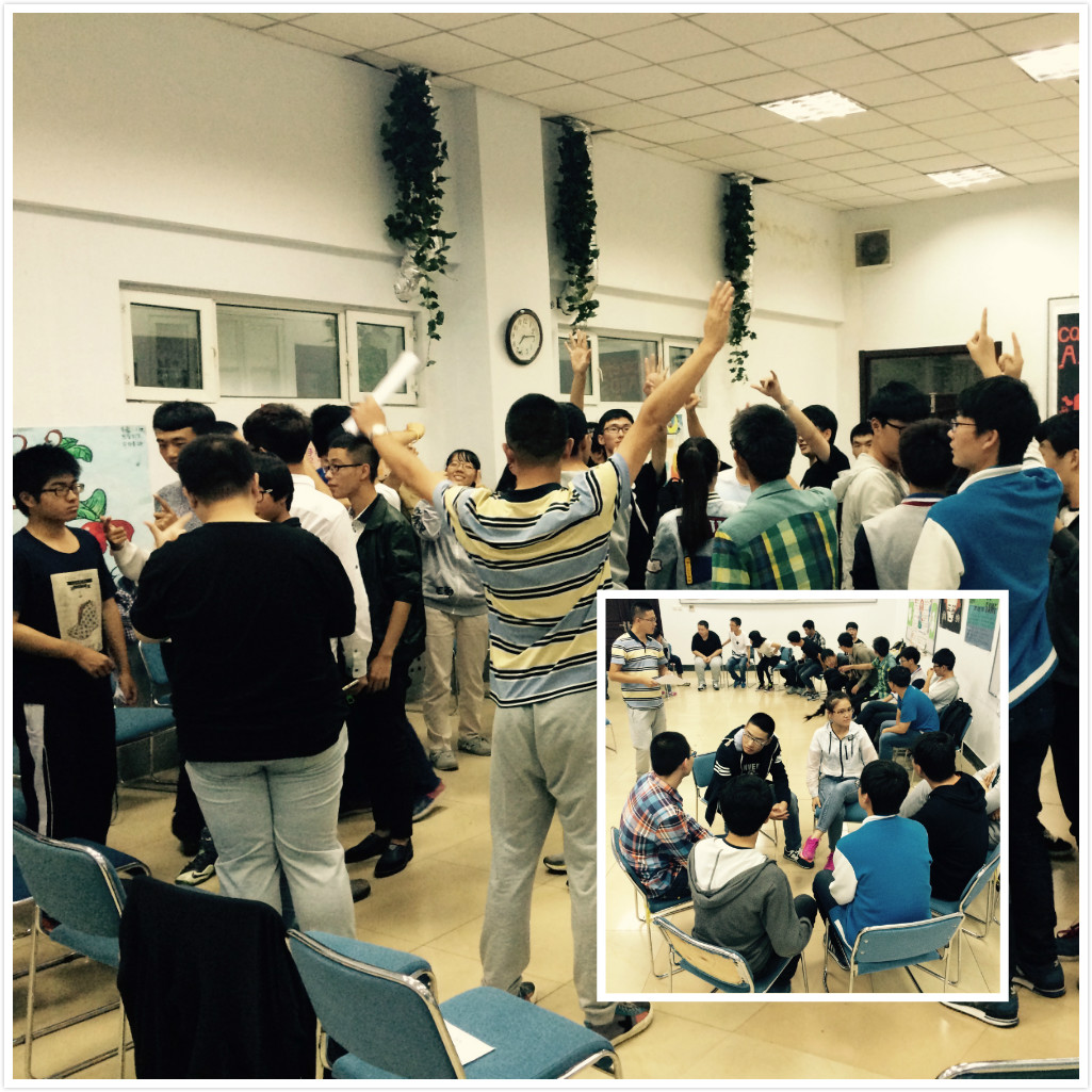 首先,王吉老师进行了3分钟的开场独白,向大家传达了此次团体活动的目的。其次,为了更快地调动气氛,使大家放松下来,进入了游戏环节——大风吹,伴随着欢声笑语,使大家真正意义上地融入在一起;紧接着为了使同学之间尽快地彼此熟悉,王吉老师让每位同学为自己设计一张“个性名片”,继而进行了“个性名片”的交流与分享;随后,根据大家出生月份、日期先后进行了“无声排队”环节,此环节考验了同学们的默契度;为进一步增进同学的相互了解,形成团体凝聚力,接下来的环节采取了分组的形势,每组六个人进行了4分钟的超级访问,大家敞开心扉,畅想未来;为了体现齐心协力、团队合作精神的重要性,本次活动加入“心有千千结”游戏环节,使同学们真正地感受到团结的力量;本次活动的最后是团队展示,每个小组独具创意的组名、口号以及亮相方式,为本次活动画上了圆满的句号。