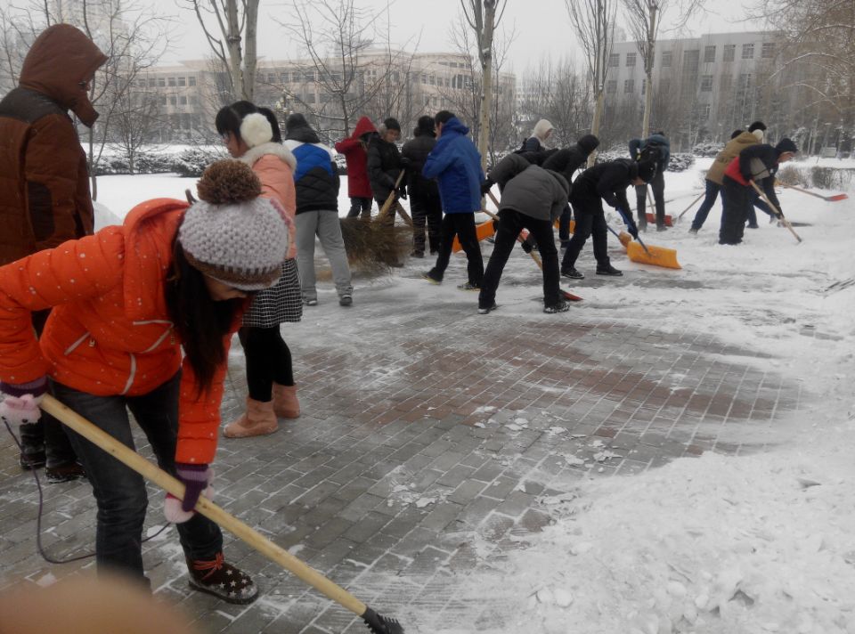 14时30分开展了“创文明城市,做文明员工”美化校园的清冰雪实践活动。按照计划beats365亚洲版官网2014级全体同学在实验楼一楼准时集合,院团委副书记王吉老师在认真分配好清雪队伍及相关负责人之后,便带领全体同学到工具保管处领取工具,期间同学们秩序井然,按照事先分配拿取工具,分配好工具后,王吉老师便带领同学们到达清雪场地。