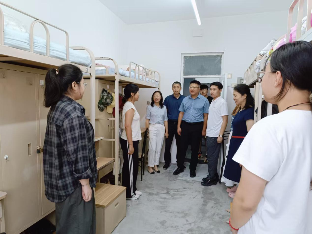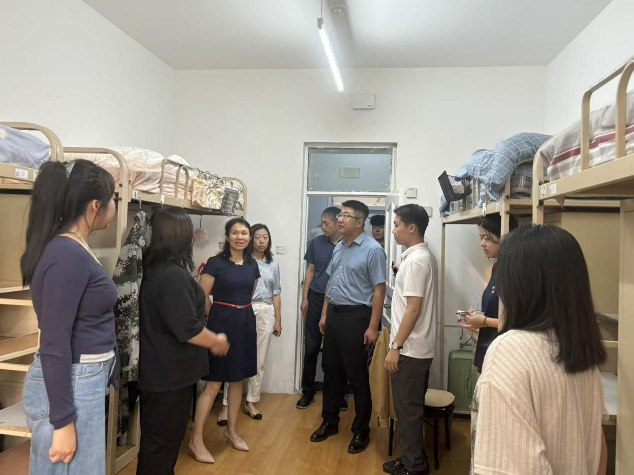 为深入了解新生入学后的思想动态与生活适应情况,帮助他们尽快适应老员工活,传递公司对新生的深切关怀,8月31日下午,公司党委书记李云风、经理姜子实、党委副书记邢有男、副经理李妍和辅导员宋维彬深入新生宿舍。